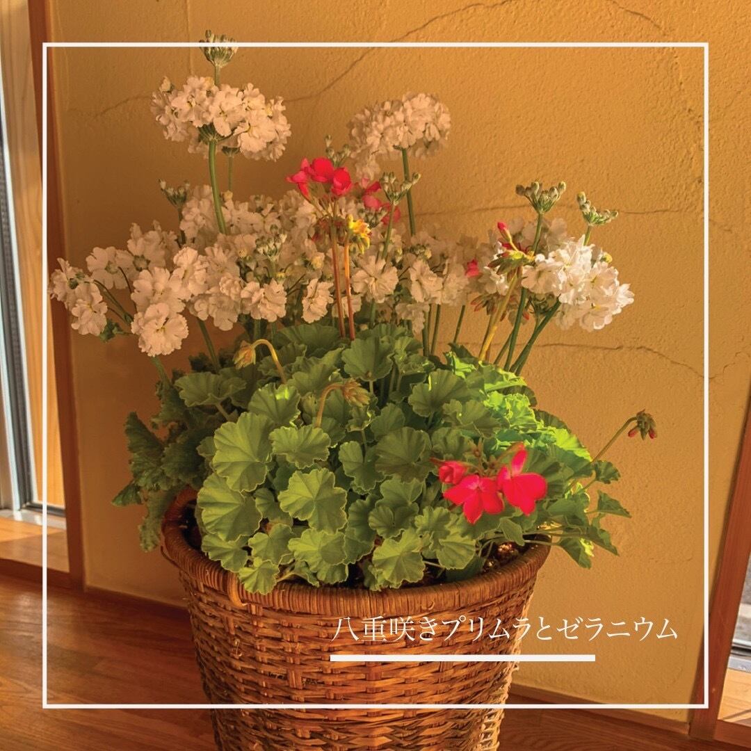 八重咲きのプリムラマラコイデス(かんざし小町)とピンクの希少ゼラニウムをレトロな籠に植えました。