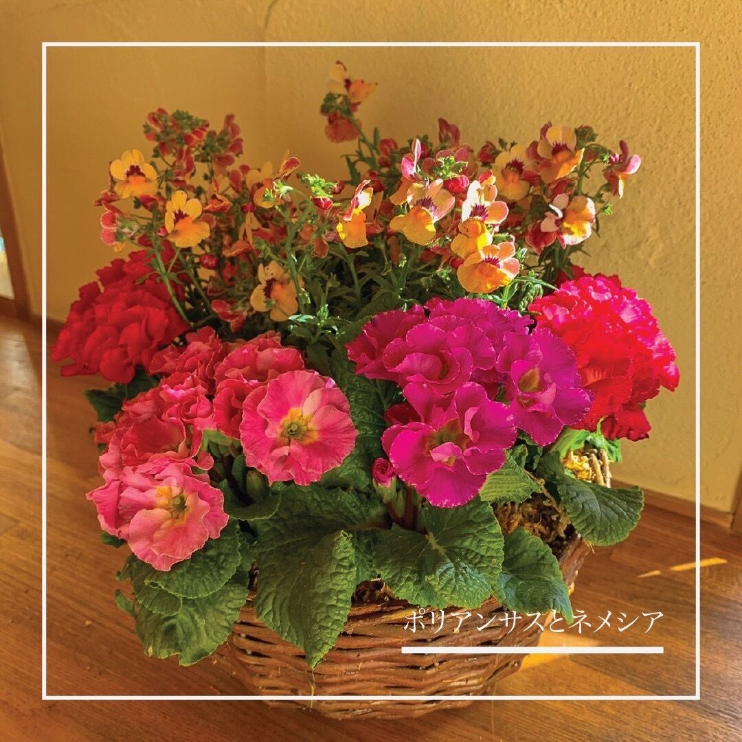 ピンクや赤、白、オレンジ色のポリアンサスとネメシアの丸い籠のブリコラージュ