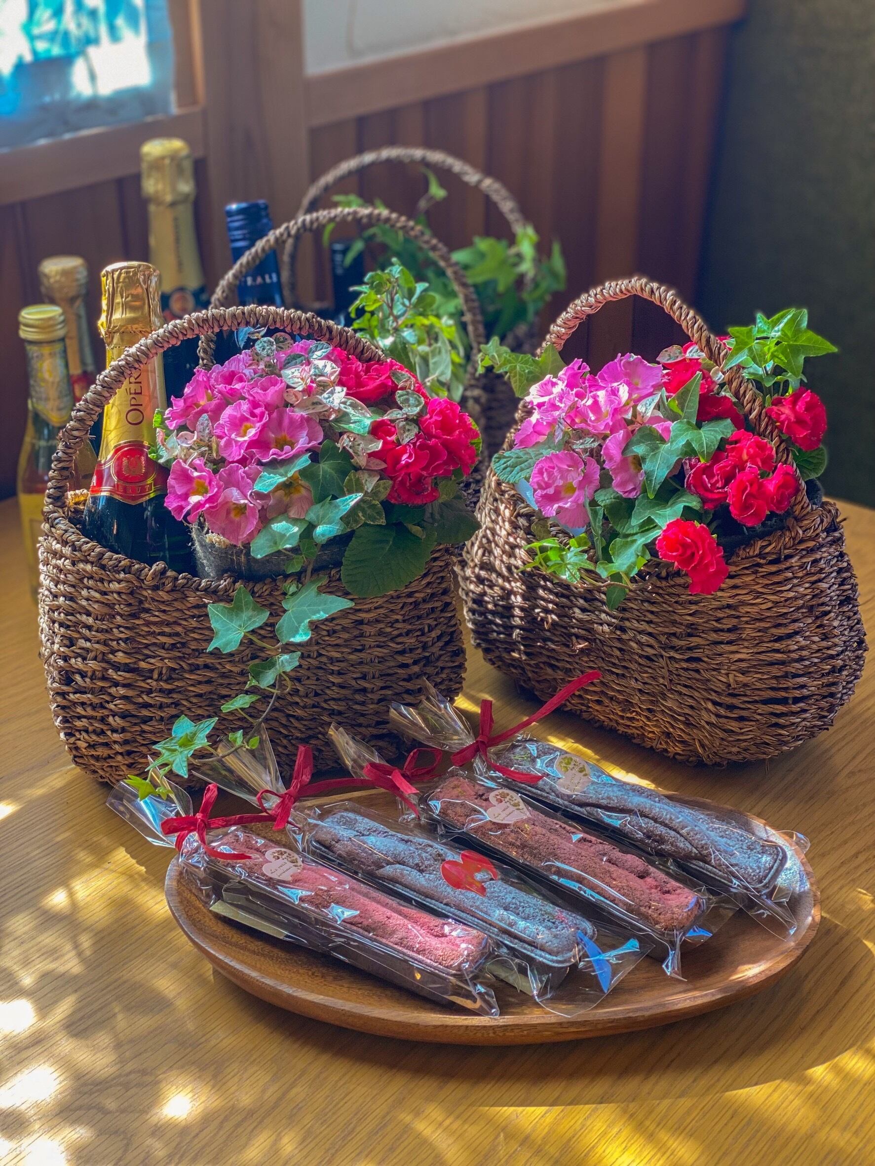 籠の中はポリアンサスやプリムラジュリアンなど明るい色味のブリコラージュフラワーと、『la maison de takakusagi』のガトーショコラを籠に入れました。限定販売です。