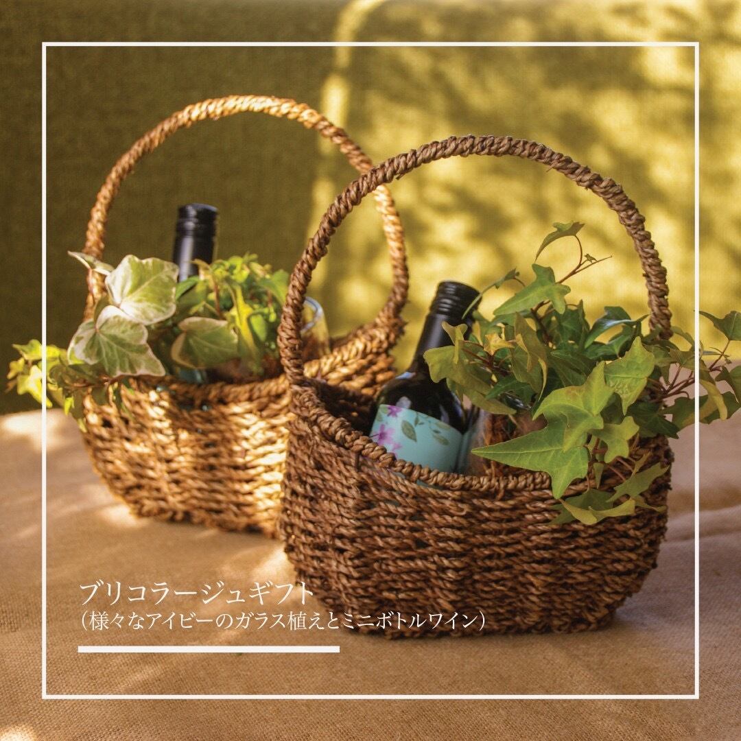 ガラス植えのアイビーとワイン(ノンアルコール有り)の籠盛りのギフトです。