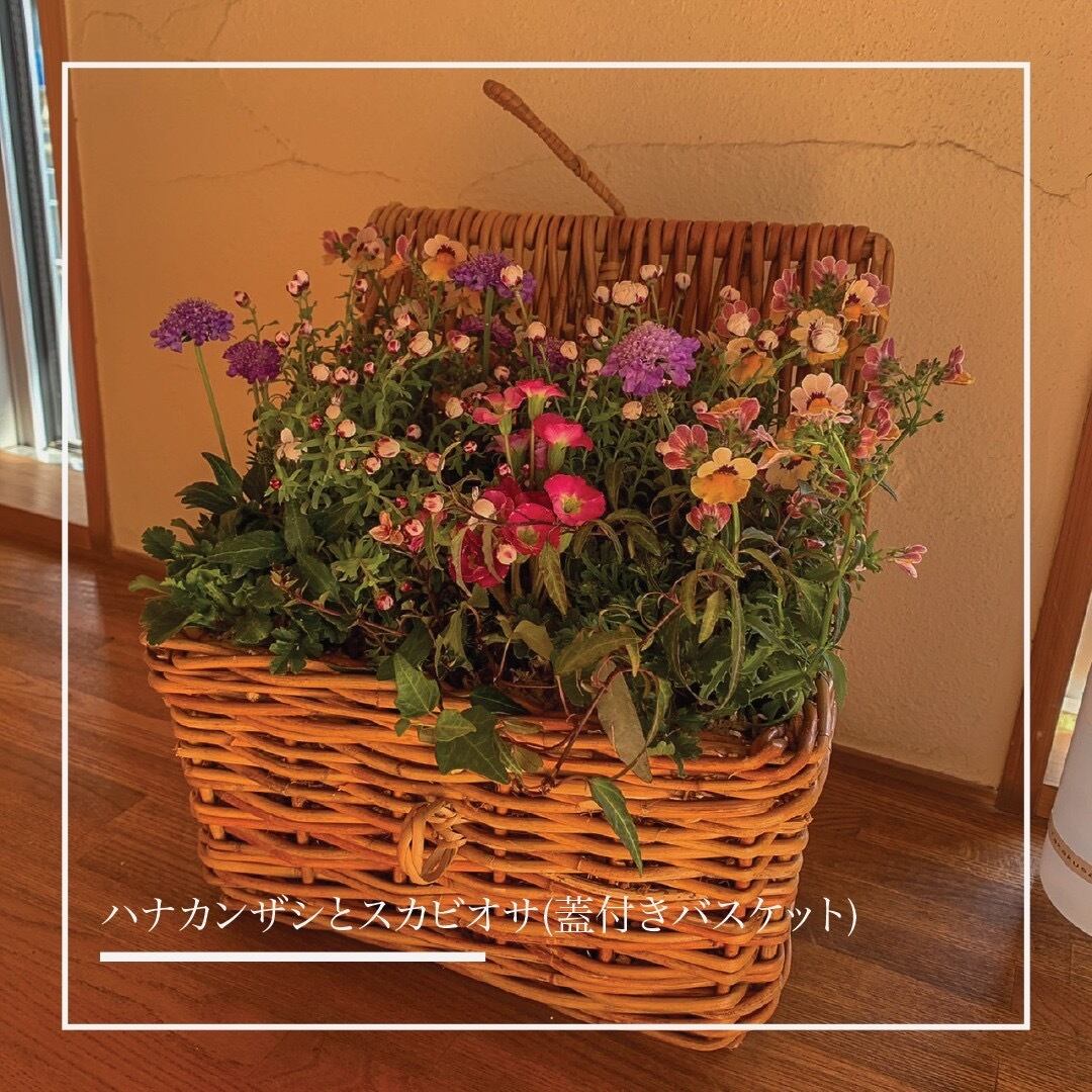 蓋付きのバスケットに盛り込んだ、ハナカンザシとスカビオサとネメシア、プリムラ。