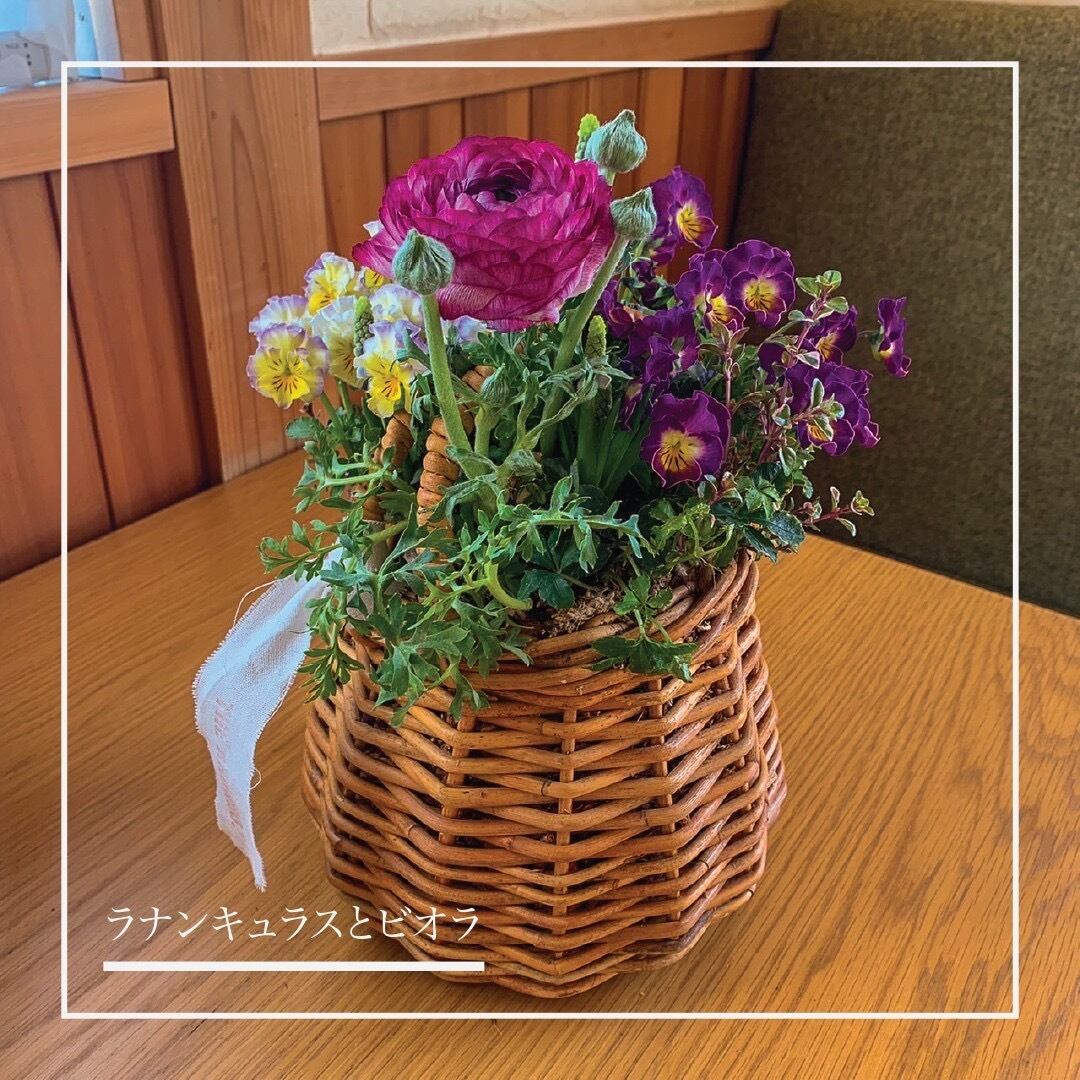 アラログバスケットに植えた、ラナンキュラスとビオラのブリコラージュフラワー。
