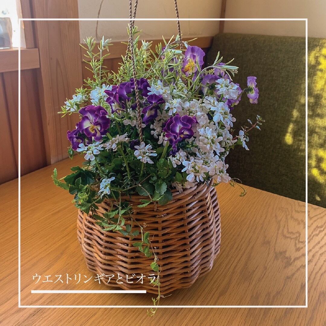 ハンギング(吊り下げ)のできる紐が付いたアラログバスケットに植えたブリコラージュフラワーです。玄関や軒下に吊り下げてお楽しみください。