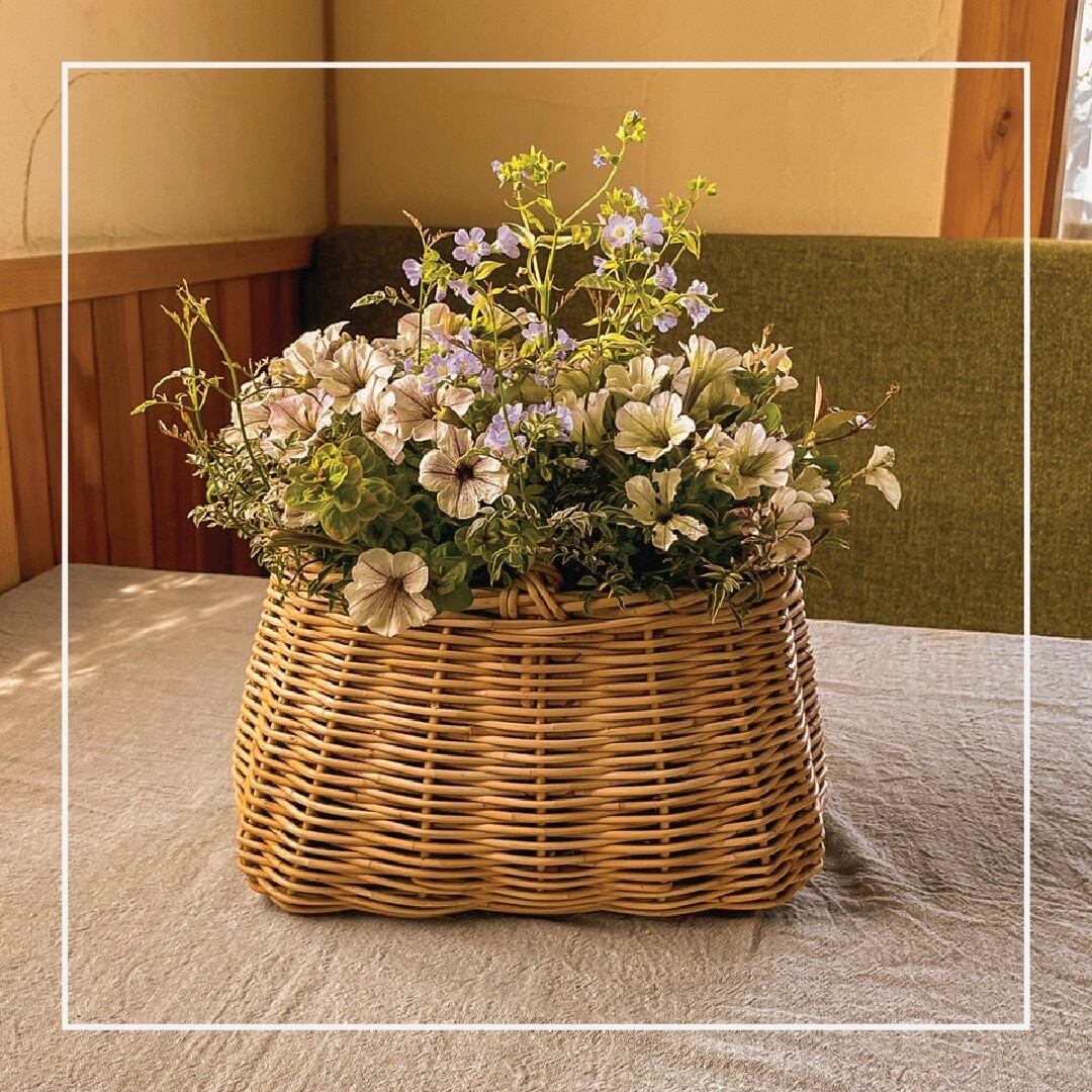 アラログバスケットにhanaoさんのペチュニアやオレガノマルゲリータなどを植えてあります。