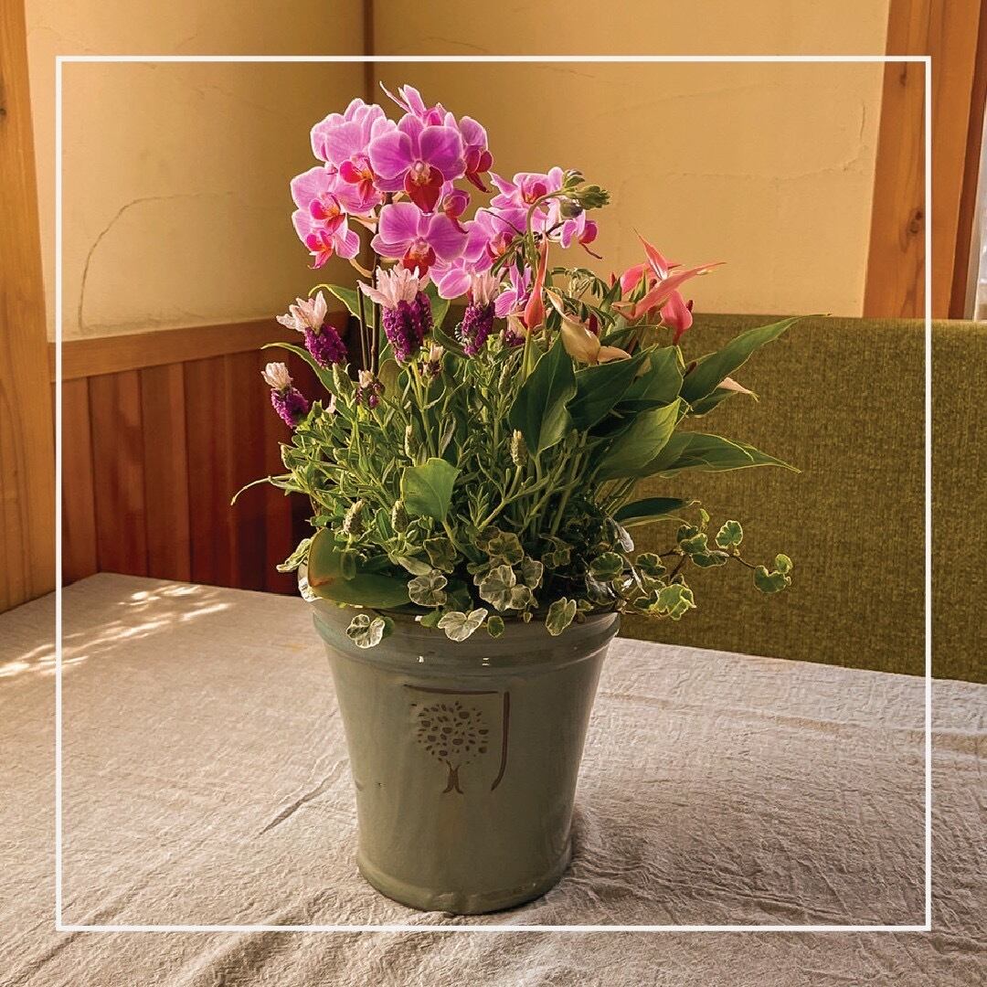 胡蝶蘭や、アンスリウムを使った寄せ植えです。