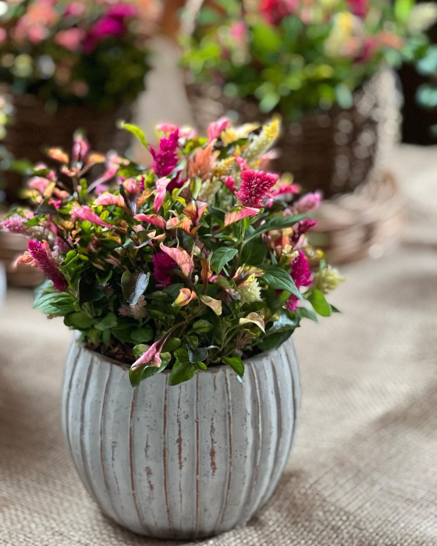 ケイトウ『キモノ』と、秋色のアルテルナンテラなどをブーケのように束ねて植えてあります。