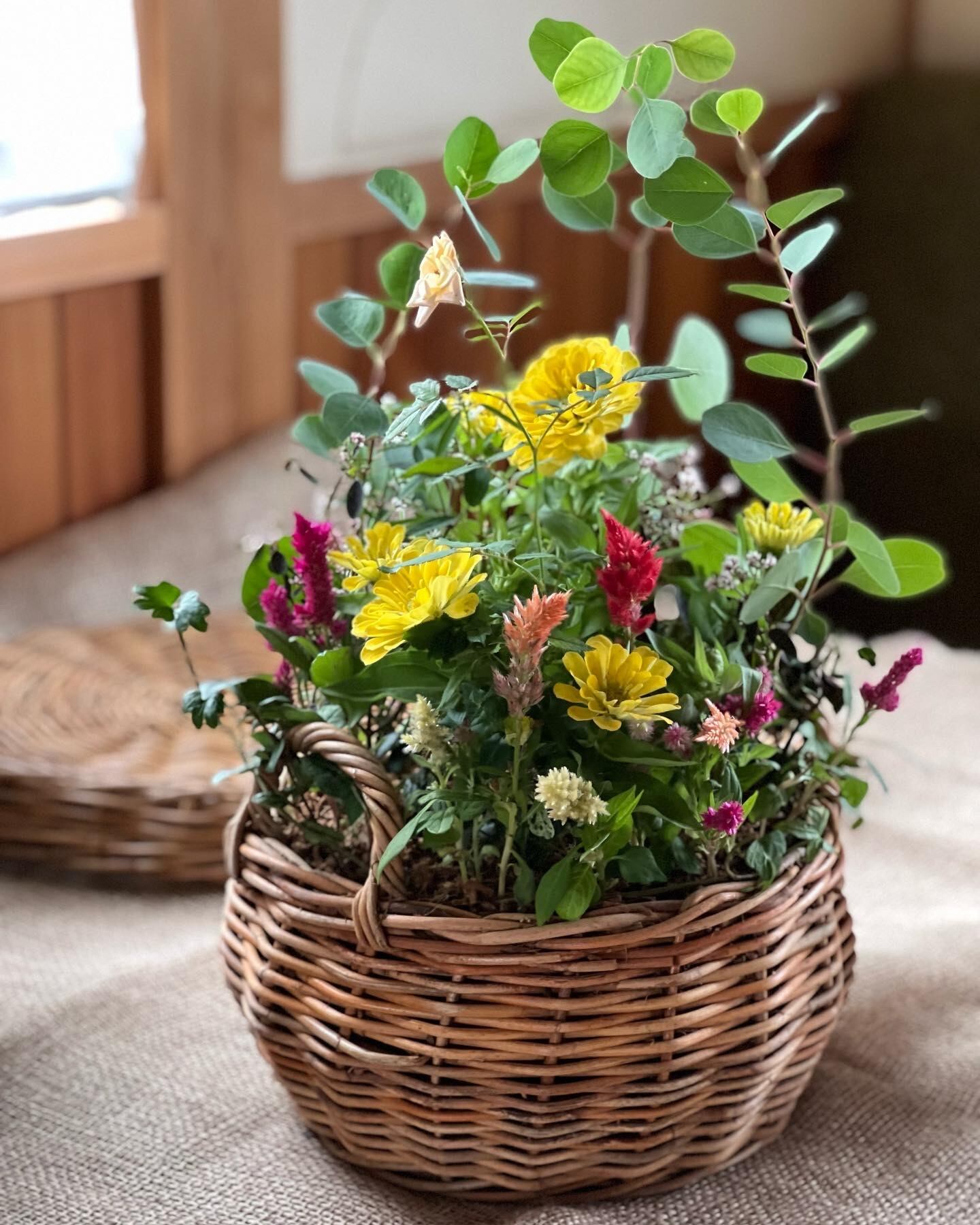アラログラタンのバスケットに、ジニア、ケイトウ『キモノ』アルテルナンテラ、ユーカリポポラス、ユーフォルビアなどを植えたブリコラージュフラワー。