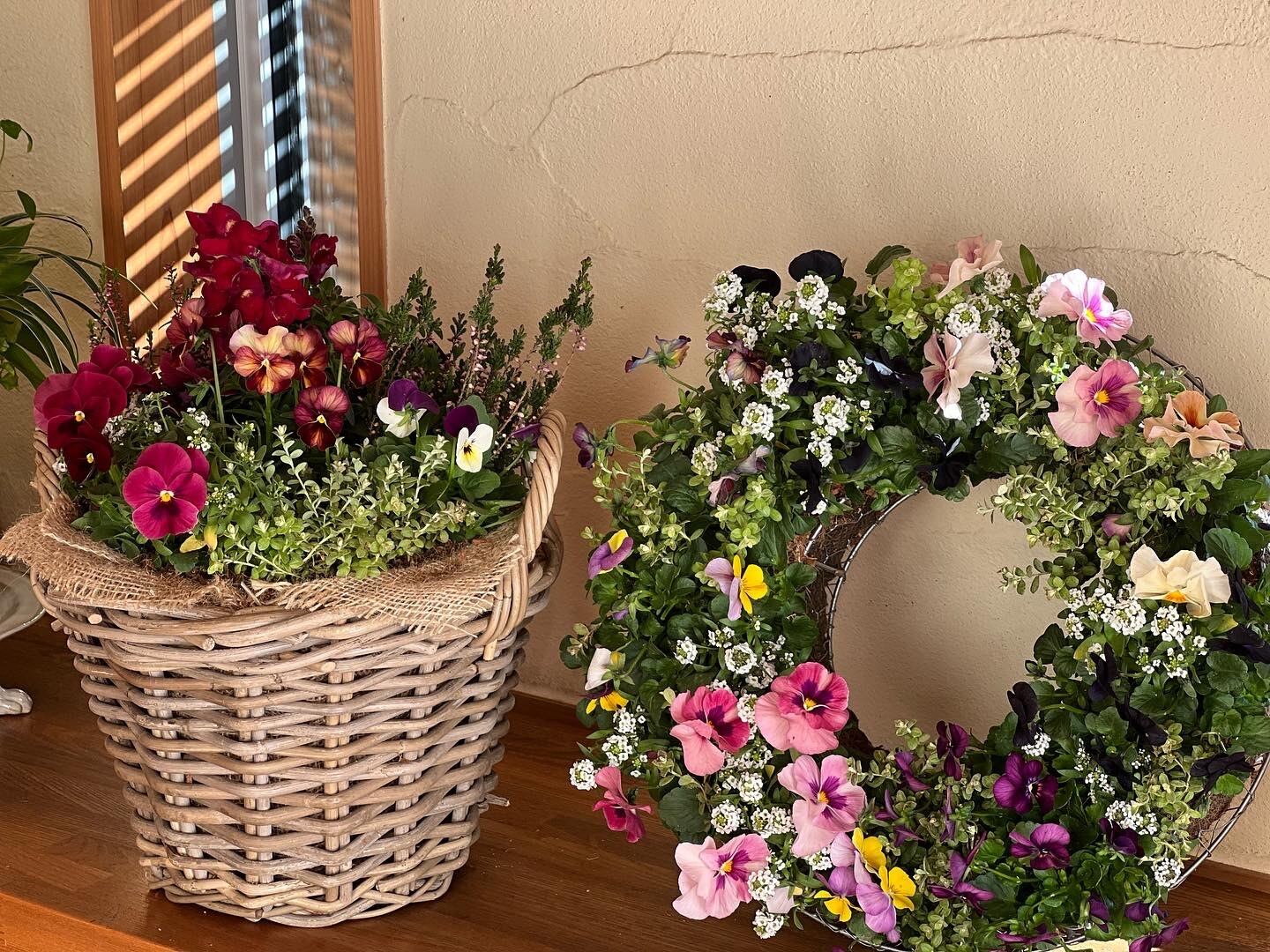 籠に植えたビオラの寄せ植え