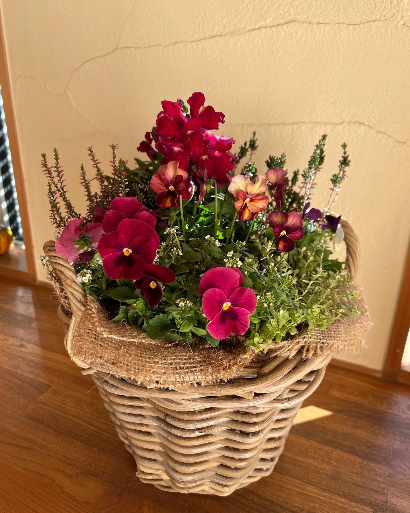 アラログラタンの籠に植えたビオラと金魚草などの寄せ植えです。